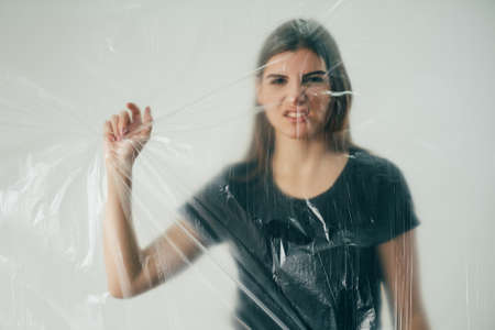 Social anxiety. Defocused art portrait. Self isolation. Panic attack. Worried disturbed woman trapped in polyethylene film on gray background out of focus.
