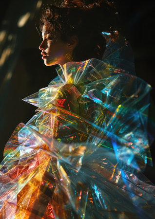 Fashion portrait of futuristic woman wearing floating 3D iridescent glass dress, organic forms, light refraction.