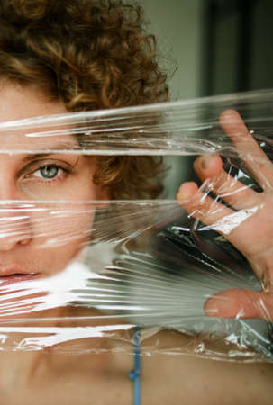 Close up shot of woman in plastic bag, look through the plastic bag.