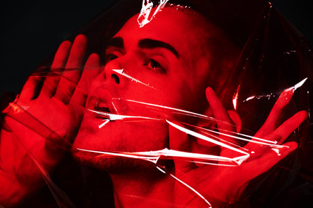 Man, red plastic and suffocating in studio isolated on black background. Polyethylene, film or person with depression, social isolation and anxiety, stress or mental health crisis, psychology or neon