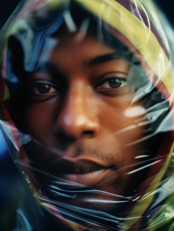Close-up portrait of a young african american man in a plastic bag.