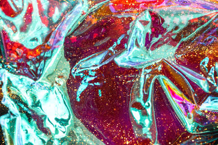 Holographic background in the style of the 80-90s. Real texture of cellophane film in bright acid colors.
