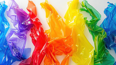 banner with multicolored rainbow plastic bag on white background with copy space. recycling concept. mockup for text