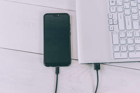 Mobile smartphone charging battery close-up on office table