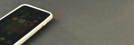 2020: Apple iPhone black smartphone showing a set of built-in app icons, closeup in darkness