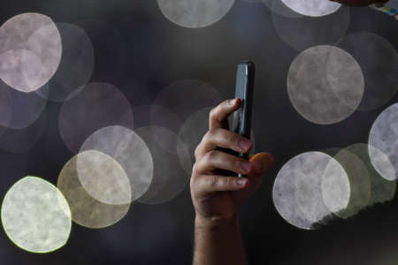 a person using a smartphone on green bokeh background, male hand holding a smartphone