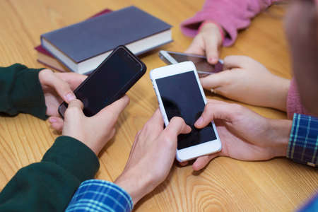 young hands with mobile phones on the table