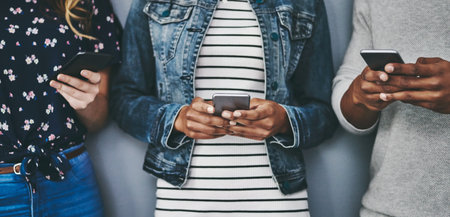 Connecting online and in real time. Cropped shot of a group of people using their smart phones in synchronicity.