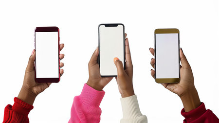 Group of people hands holding mobile phones with blank screen on gradient background