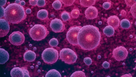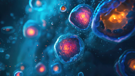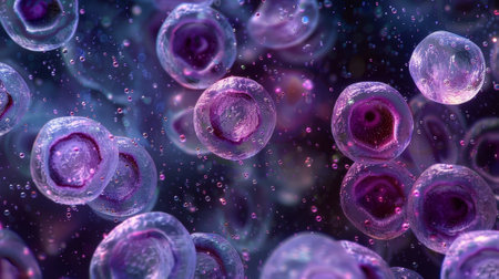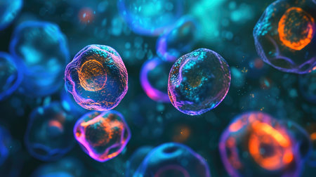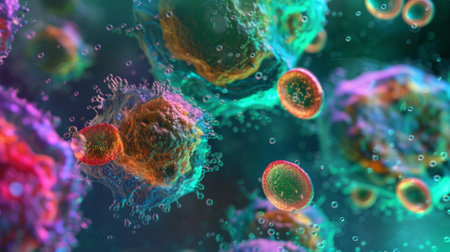 Stunning closeup of vibrant cells floating in a dynamic environment. Perfect for science and health themes, emphasizing exploration and microscopic beauty in biology.