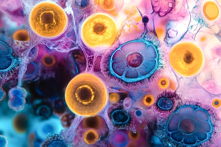 Vivid microscopic imagery showcasing intricate cellular structures illuminated in various colors, revealing the beauty of life at a microscopic level.
