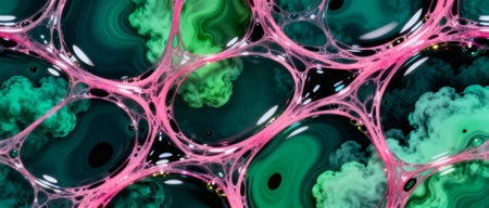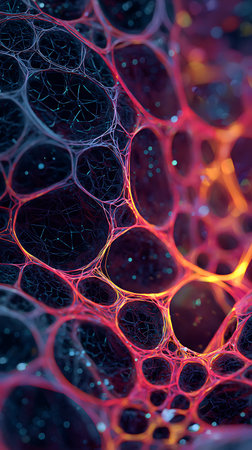 Discover a vibrant abstract microstructure showcasing cells and biological elements, illuminated with stunning colors and intricate patterns that evoke creativity.