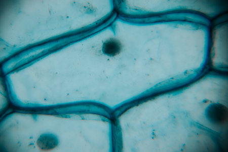 Close-up of plant stem cells under microscope, intricate patterns, high detail, with copy space
