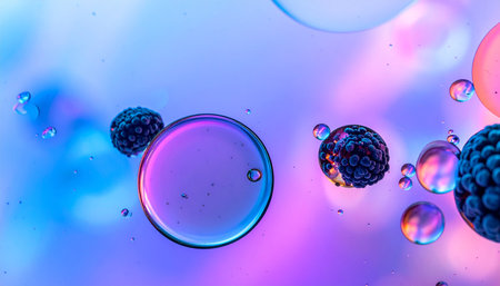 Beautiful and bright cell bodies under the microscope. Close-up of molecules of different colors with bubbles.