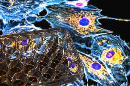 Achievements of modern biological science. A 24-well cell culture plate against an abstract biological background.