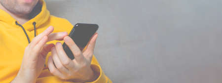 Unrecognizable caucasian man in yellow sweatshirt is searching in cell phone. Close-up. Black mobile phone in male hands. Guy sitting on couch with smartphone. Banner. Copy space.