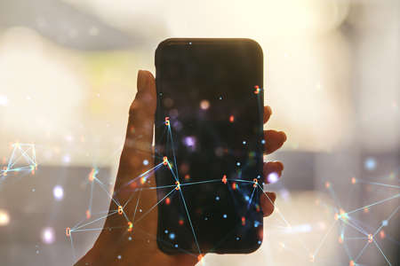 Double exposure of technology hologram and hand with cell phone on background. Research and development software concept