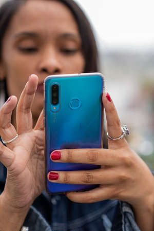 Close-up image using modern smartphone device social and checking email or working networking concept