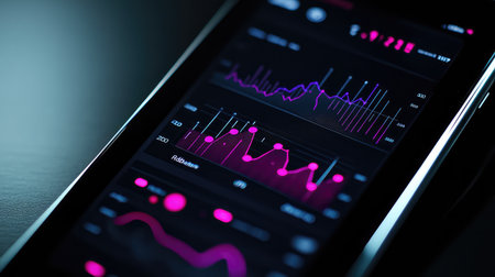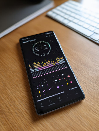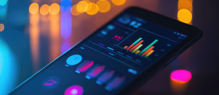 A sleek smartphone showcases colorful graphs and data analytics in a dimly lit environment, reflecting advanced technology and digital innovation late at night.