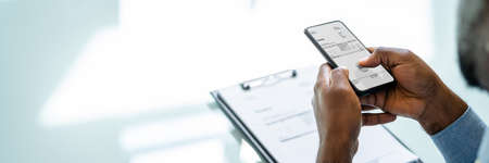 Businessman hands checks business report on cellphone. Business and financial success concept. Close up