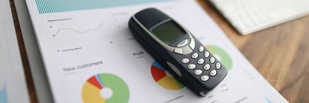 Phone is statistical report, profit from customers. Calling customers during self-isolation. Calculation profit and loss during quarantine. Workplace at home. Analysis for certain period