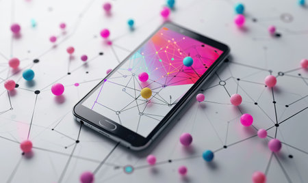 A sleek smartphone stands on a wooden table, showcasing a colorful network puzzle with nodes and connections in a warmly lit cafe during the evening hours..