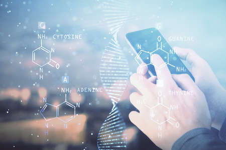 Double exposure of man's hands holding and using a phone and DNA drawing. Medical education concept.