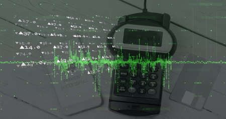 Image of financial data processing over payment terminal. global finances, business and contactless payment concept digitally generated image.