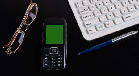 Business concept. Business accessories - keyboard, glasses, ballpoint pen and telephone with a green screen