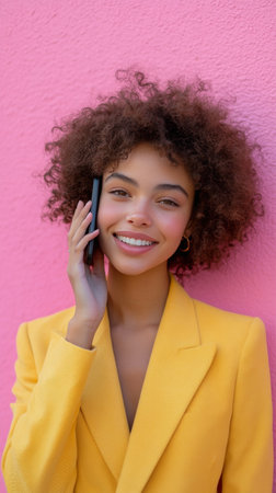 A woman with curly hair wears a yellow blazer while smiling and chatting on her phone. She leans against a vivid pink wall adorned with graffiti in an urban environment.