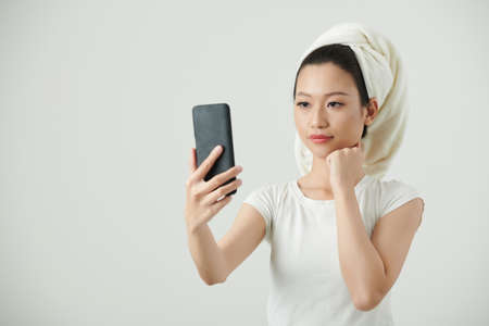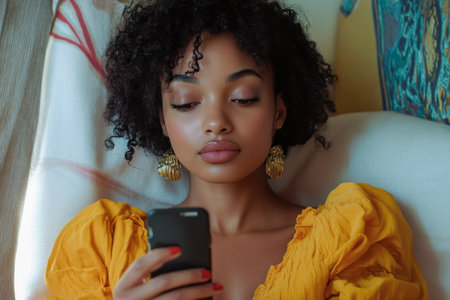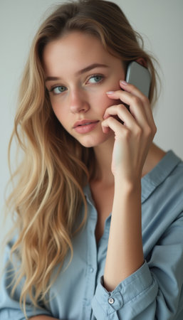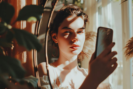 Young woman with natural makeup using smartphone indoors, focused expression, modern casual hairstyle, soft daylight ambiance.