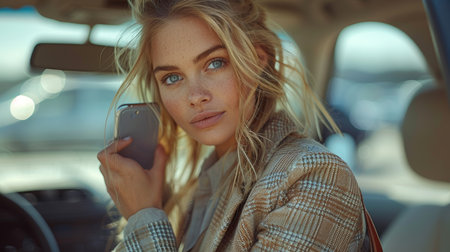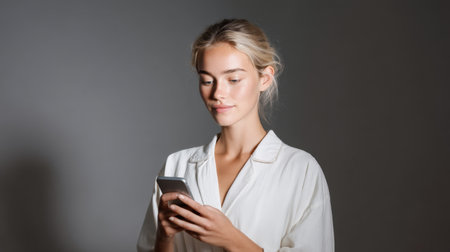 A young woman with light hair is absorbed in her smartphone, showcasing a moment of personal engagement in a modern environment, evoking themes of technology and connectivity.