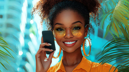 Portrait of a cheerful woman holding a smartphone, wearing vibrant clothing, against a lush outdoor background with plants and sunlight. Captures happiness, communication, and a vibrant urban lifestyle.