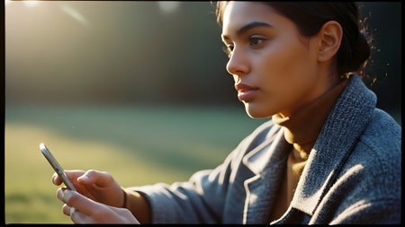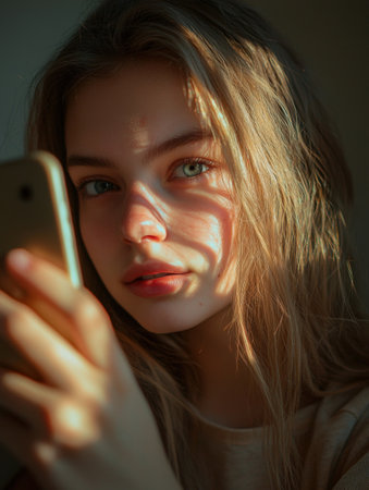 A young woman softly illuminated by warm light holds a smartphone while lost in thought. The atmosphere is calm, with gentle shadows accentuating its features.