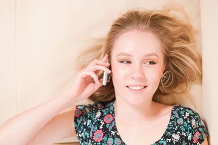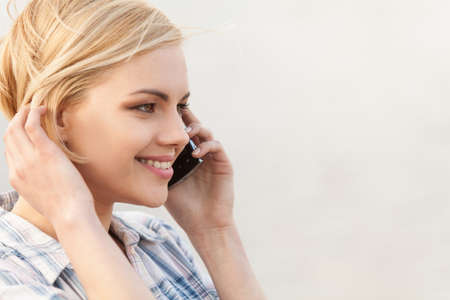 pretty blond talking on cellphone and smiling. closeup on happy beautiful girl face with phone