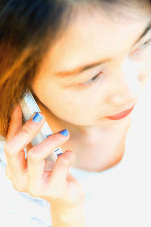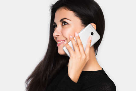 portrait of beautiful girl with phone conversation. Isolated on light white background