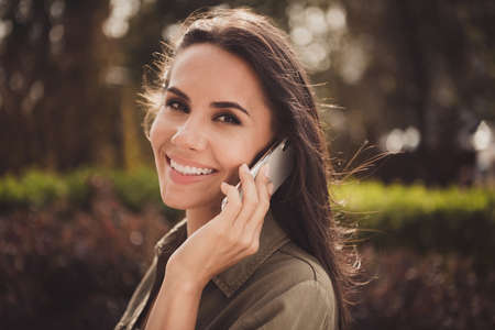 Photo of charming positive young lady look camera hold telephone make call wear brown shirt park street outdoors