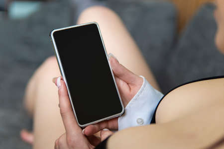 Female fingers with selective focus. Smartphone in hands, abstract background with copy space for text.