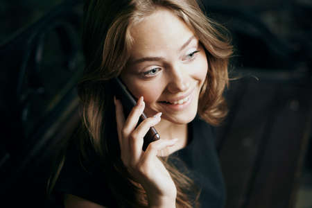 Portrait of modern businesswoman woman fashionable girl talking on the mobile phone smartphone. Indoor.