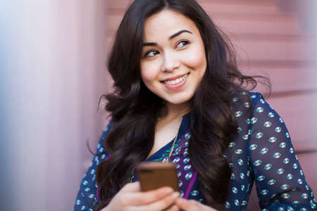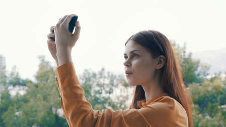 Young beautiful woman is making a photo on the phone outdoors in the city.