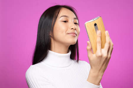 woman of asian appearance holding phone in hands internet communication technology blue background