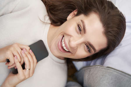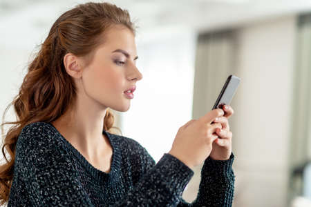 Attractive young woman looking at her smart phone at home. Woman types message on her smart phone.
