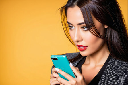 Young woman with red hair and colorful eye makeup looking at smartphone closeup, vibrant yellow background and focused expression for technology and lifestyle concept.