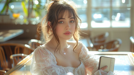 Young Woman Sitting in Cozy Café Holding Notebook During Late Afternoon Light