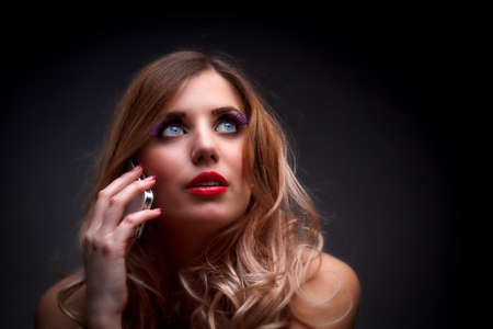 Beautiful blonde in a Hollywood manner with curls, dark lips, mirror in hand. Beauty face and hair. Picture taken in the studio