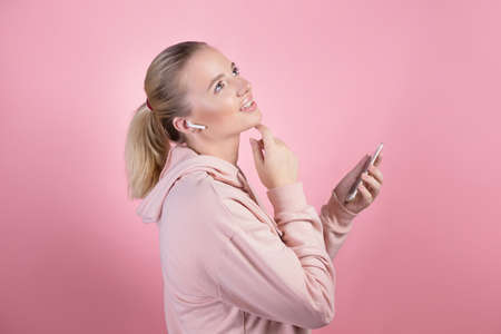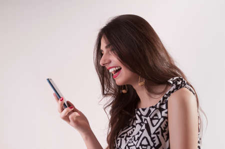 Close up portrait in profile of attractive young happy woman look up with smart phone with healthy toothy smile on light grey background. Technology and business theme.