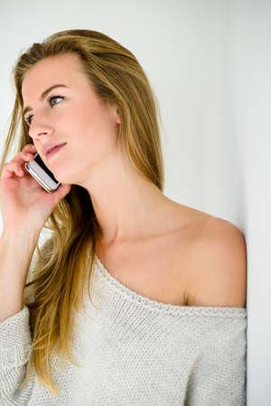 Image of a smiling pleased young beautiful woman talking by mobile phone indoors at home.