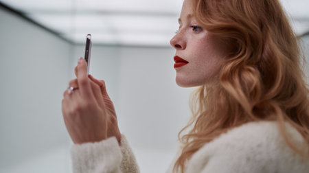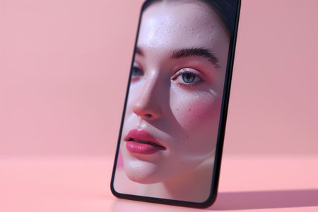 Person examines their reflection with augmented reality filters applying digital lipstick and eyeshadow in a bright minimalist setting.