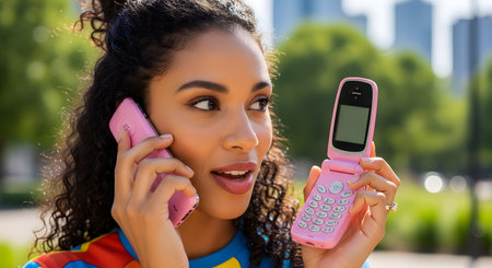 A stylish young woman holds two retro pink flip phones outdoors, talking on one while holding the other open. The image captures a nostalgic 2000s aesthetic, blending vintage technology with modern fashion.