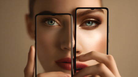 person holding smartphones that display close-up fragments of their face. persons face is partially replaced by embedded smartphones displaying facial parts such us eyes, lips